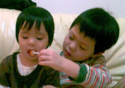 我很不喜歡小孩吃糖,對小濰的限制是每天最多一顆,飯後才准吃。這天小濰很乖,早早就吃完飯,一同前來晚餐的濰舅與舅媽賞了棒棒糖~ 哥哥正眉開眼笑享用棒棒糖,妹妹也湊到一旁討吃,大方的小濰不時給妹妹舔上幾口,嚐到甜頭的辣椒笑得之開心的!